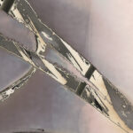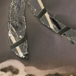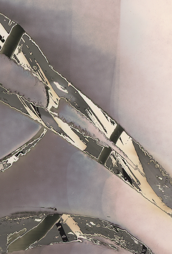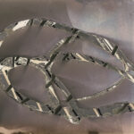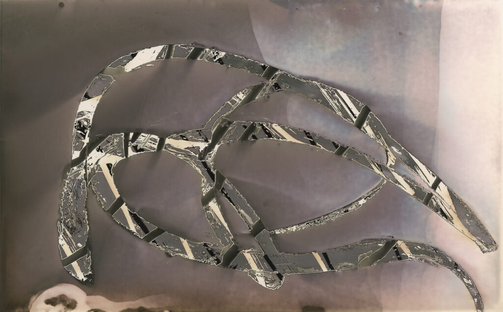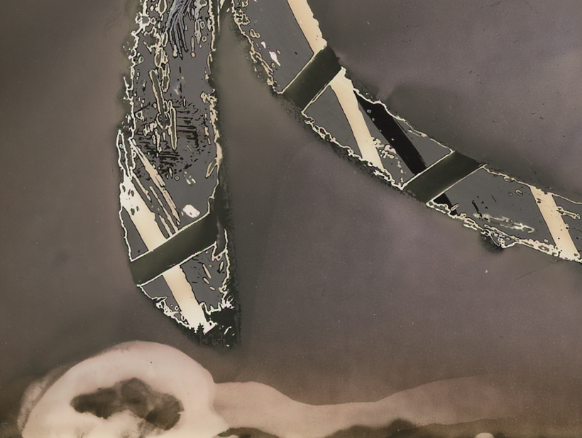 Take note of the detail from the black background chemigram, where you see a little bit of pinkish purple where the butter was. This is not a pinkish purple that was created chemically, but rather an unstable lumen area whose color is the result of light exposure. It happened because butter was not removed from that area of the print before the 3 minute fixing bath. It was later removed by washing the print in dish washing soap before the final 5 minute running water bath. Being that it is unfixed, it will continue to change over time, getting darker and maybe shifting hue. If I fix it now, after having been exposed to a lot of light, it will likely “bleach back” to an off-white or yellow.